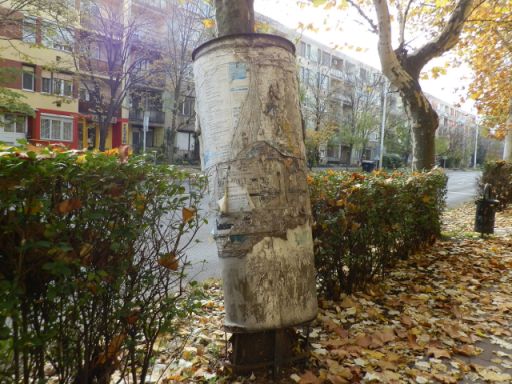 Ennek a táblának a közelébe bukkantam egy másik, számomra szívet melengető szörnyűségre. Egy klasszikus, fa köré szerelt hirdetőoszlopra. Amiből egyébként még viszonylag sok akad a városban. Csak van, amelyiket felújították és használják, és van, amelyiken csak gyűlnek, gyűlnek a plakátok. Ja, és van egy nagyon szépen megőrzött, üres a Városmajor úton. Tényleg a múlt iránti perverzió, de én nagyon vigyáznék rá, hogy néhány év múlva a szolnoki gyerekeknek élőben is meg lehessen mutatni, hová kerültek egykor a nyomtatott plakátok. Visítani fognak, ha a telefonjuk kijelzője után megérinthetnek egy ilyet.