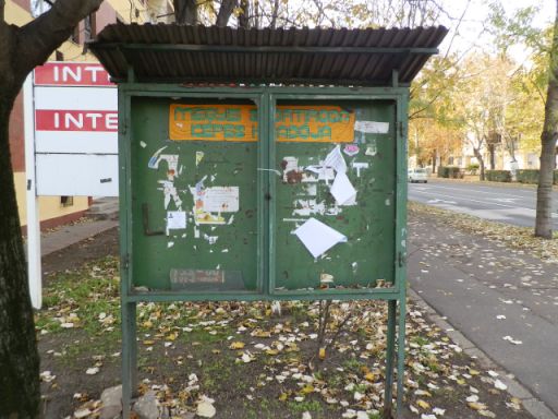 Találni Szolnokon néhány klasszikus darabot is, amelyek bár borzasztóan néznek ki, mégis vérezne a szívem, ha elbontanák őket. Ilyen például a néhai „Megyei sportiroda képes híradója” címet viselő, egykor üvegajtós hirdetőtábla. A Mátyás király és a Levente út sarkán, az áruház parkolója mellett áll. Az öregebbek tudják, hogy az üzletközpont helyén valamikor működő Ifjúsági sporttelep (MOVE-pálya, MTE-pálya, kinek hogy tetszik) miatt került ide. És valami rejtélyes oknál fogva máig a helyén maradhatott. Milyen klassz lenne megmenteni, és mondjuk a több mint száz évig a szolnoki sportéletet kiszolgáló pályának emléket állítani benne. (Hol a bili a kezemnek?)
