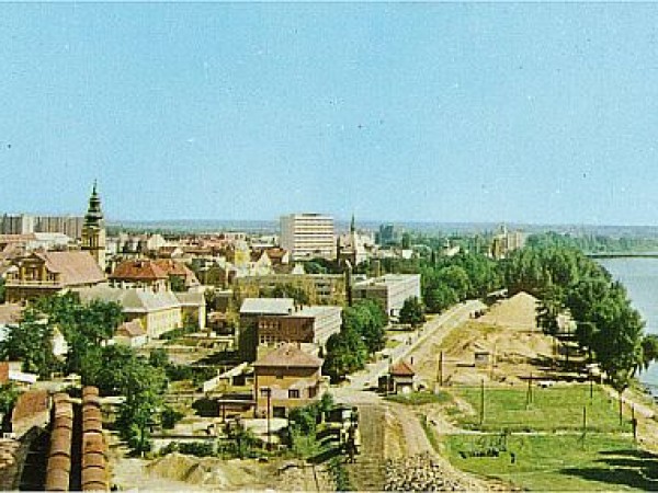 Egészen egyértelmű, hogy Attila nevű olvasónktól kapott újabb fotót a tárház tetejéről készítették – szerintem – valamikor a hetvenes évek közepén. A kép közepén már ott a színház melletti tízemeletes katonai lakóház – városépítészeti bűncselekmény -, tőle jobbra pedig a MÁV kórház vörös tömbje is látszik, így biztos, hogy 1967 után vagyunk. Mivel a Tisza-parti sétány felénk eső végén már áll a középiskolai kollégium, utána pedig a Tiszaparti Gimnázium és talán a Pálfy épülete is, a fotózásnak legalább 1971-72 után kellett történnie. Azonban a kép bal széle és a nagytemplom tornya között már létható az Ady Endre úton felhúzott – itt azonban még készülőben lévő – tízemeletes házak miatt a fotósnak 1974-75 körül kellett felkapaszkodnia az akkor jó negyvenéves tárház tetejére.
