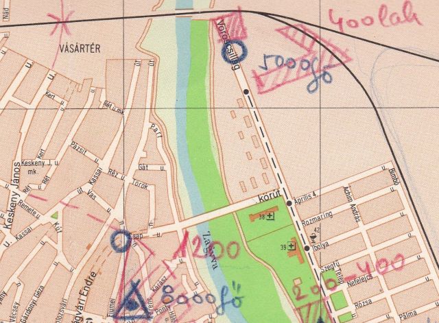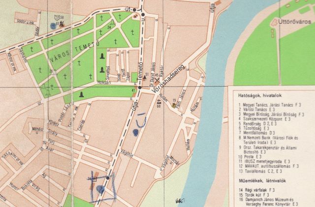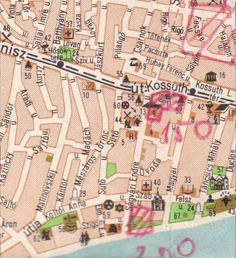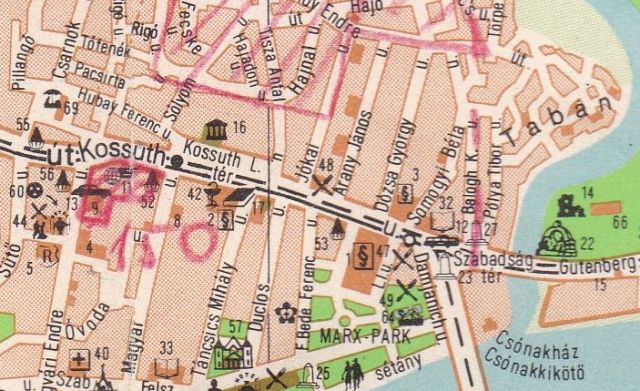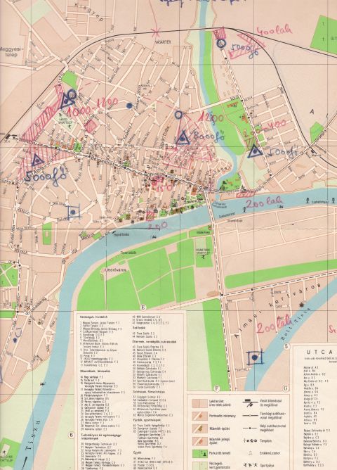 Az itt bemutatott térkép – aminek eredetijét a Szegő Gábor Általános Iskola őrzi – igazi különlegessége a később kézzel rárajzolt jelek és számok. Úgy tippelem, hogy ezek valamikor a hatvanas-hetvenes évek fordulóján kerülhettek a nyomtatványra, legalábbis erre utal a Kun Béla és a Szántó körutak nyomvonalainak pontos bejelölése. A számok és a jelek alapján úgy gondolom, hogy aki „összefirkálta” ezt a térképet, az a város átépítéséhez kapcsolódó iskolafejlesztéseket próbálta rögzíteni. Azaz azt, hogy az új lakótelepek építése – vasút környéke, Móra Ferenc úti lakótelep, Tallinn városrész – és várható lakosságszáma miatt hol lesz szükség új oktatási intézményekre. A rajzoló pirossal lehatárolta és átlós vonalakkal satírozta az új lakóterületeket, és kék háromszögekkel jelölte a majdani iskolákat. Amelyek közül a Kőrösi, a Mátyás király úti és a Fiumei meg is valósult. A Tallinn városrész iskoláját viszont a későbbi KISZ-bizottság helyére tervezte. Ami érdekes, hogy a Rákóczi úti, az Abonyi úti és a Kertvárosi iskola is rákerült a térképre, igaz, más jelzéssel, ami talán a bővítésre vagy felújításra, netán a méretbeli különbségre utalhatott. Az mindenesetre érdekes, hogy a mai Gutenberg tér, az Árkád és a Tiszai hajósok tere környékén is lakosságszám növekedéssel számolt a rajzoló, amelyek közül az első kettő talán meg is valósult, az utóbbi viszont rejtélyes utalás maradt.
