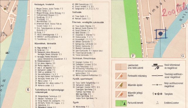 Számomra legalább ugyanilyen izgalmas a korabeli művelődési intézmények felsorolása és jelölése. Mert azt ugye tudjuk, hogy ekkor már nemcsak színházépülete, de társulata is volt Szolnoknak. A város 1965-ös térképe kapcsán már arról is írtam, hogy akkoriban két szabadtéri színpad működött: egyik a Belvárosi templom kertjében, a mai Mustármag óvoda helyén, a másik pedig a Járműjavító Művelődési Házánál. E térkép szerint ezek már az ötvenes években is léteztek, ám azzal most szembesültem először, hogy akkoriban a járműjavító művházát „Millennium, nyilvános, üzemi kultúrotthonként” tartották nyilván. Minden bizonnyal azért, mert 1956 augusztusában ünnepelték az intézmény alapításának 100. évfordulóját.