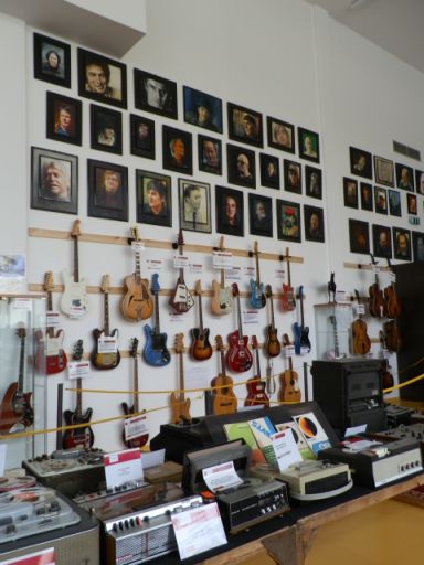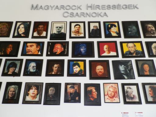 A múzeum legnagyobb kiállítóterébe egy olyan folyosón keresztül juthatunk be, amelynek plafonját hírességek neon aláírásai díszítik, ami csak egy picit ciki. A tornacsarnoknyi nagyterem viszont elsőre lenyűgöző: hangszerek, erősítők, zongorák és mindenféle kellékek tömegei mellett a Magyarock Hírességek Csarnokát is itt találjuk. Azaz a honi rockzene szereplőinek portré festményeit nézegethetjük. Igaz, arra nem tudtam rájönni, hogy pontosan milyen logika szerint kerültek ide az arcok, ugyanis van, aki többször is szerepel, míg sokan fájóan hiányoznak.