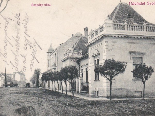 Azt mindenesetre ez a legalább 120 éves fotó is bizonyítja, hogy Szolnokon az előző századforduló után nem sokkal a Szapáry utca végén már áramszolgáltatás is volt, hiszen a lap bal szélén, egy oszlopokra helyezett trafószekrény látható. A másik oldalon, a két szép épület előtt pedig széles járda fut, amit néhány éves, egyforma fajtájú fák sora választ el a nem éppen hívogató kocsiúttól. Ne feledjük, ez a rész majd csak nagyjából másfél évtized múlva lesz először tér – Erzsébet királynéról elnevezve -, és addig egy nem túl forgalmas utcavég volt, amitől pár méterre már kövezett kocsiutat lehetett találni.
