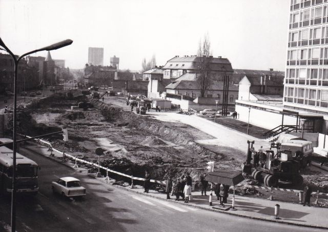 És bő négy évtized távlatából a közlekedésről is érdemes szót ejteni. A legérdekesebb a jobb alsó sarokban lévő két lábon álló, hullámtetős, kis építmény. Ezen a képen nem látszik jól a funkciója, de más fotók alapján tudható, hogy ez a posztoló közlekedési rendőröket védte a naptól és a csapadéktól. Az viszont újdonság számomra, hogy olyan, mintha a kis tető alatt, fix állványon valami kapcsolótábla is lenne. Személyes emlékeim nincsenek, de nem lennék meglepődve, ha kiderülne, hogy a posztoló rendőr onnan tudta irányítani a kereszteződés lámpáit, és ezzel az ekkoriban már komolynak tekinthető forgalmat. Amit nemcsak a tranzit kamionok és a bal szélen látható „faros Bözsik” nehezítettek, de azok a billencs ZIL-ek is, amelyek e kép tanúsága szerint az óriási földmunkában segédkeztek. Hozzájuk képest a fehér füstöt eresztő Trabant kismiska volt a kibocsájtott bűz és hang tekintetében.