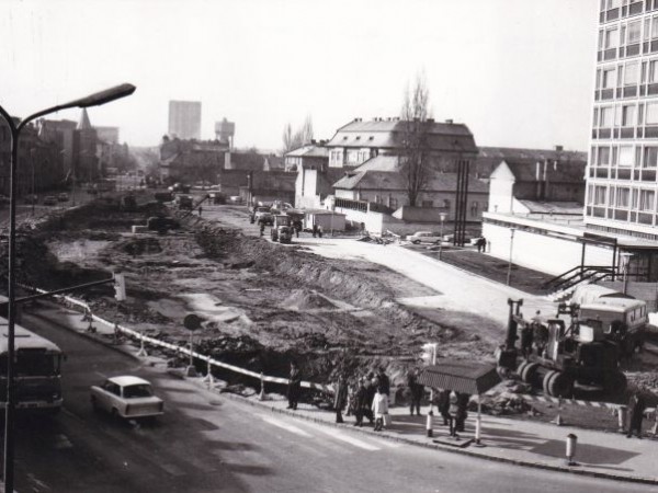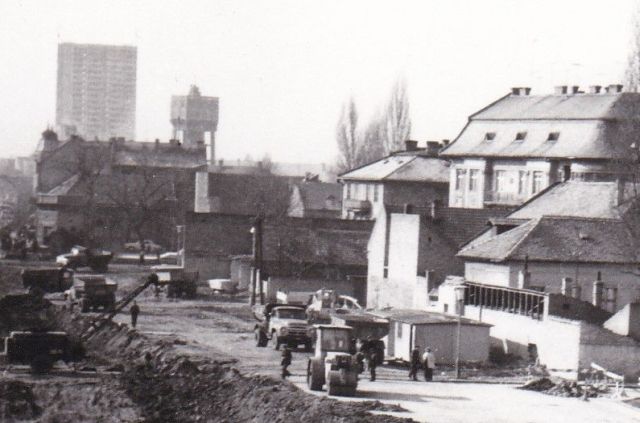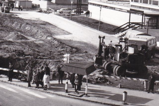 És bő négy évtized távlatából a közlekedésről is érdemes szót ejteni. A legérdekesebb a jobb alsó sarokban lévő két lábon álló, hullámtetős, kis építmény. Ezen a képen nem látszik jól a funkciója, de más fotók alapján tudható, hogy ez a posztoló közlekedési rendőröket védte a naptól és a csapadéktól. Az viszont újdonság számomra, hogy olyan, mintha a kis tető alatt, fix állványon valami kapcsolótábla is lenne. Személyes emlékeim nincsenek, de nem lennék meglepődve, ha kiderülne, hogy a posztoló rendőr onnan tudta irányítani a kereszteződés lámpáit, és ezzel az ekkoriban már komolynak tekinthető forgalmat. Amit nemcsak a tranzit kamionok és a bal szélen látható „faros Bözsik” nehezítettek, de azok a billencs ZIL-ek is, amelyek e kép tanúsága szerint az óriási földmunkában segédkeztek. Hozzájuk képest a fehér füstöt eresztő Trabant kismiska volt a kibocsájtott bűz és hang tekintetében.