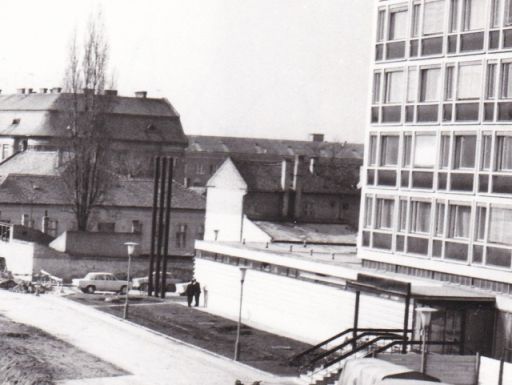 Kezdjük a jobb oldalon álló pártházzal, amiben ekkor már majdnem egy évtizede székelt az állampárt városi és megyei szervezete. A hozzá kapcsolódó lapos tetős szárny pedig pártgarázsként funkcionált, azaz itt parkoltak az apparátust szállító Volgák és Polski Fiatok. Jól látható, hogy a legnagyobb felfordulás közepette is fontos szempont volt a pártház megközelítése, elég csak a „fehéren világító”, kövezett utat és a mellett álló ufó-lámpákat figyelni. Amik egyben arra is utalnak, hogy a város alapításának 900 éves évfordulójához igazított beruházás idején a Hubay utca felől közlekedtek az elvtársak.