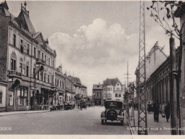 A képeslappá lett fotó alapján ugyanakkor talán azt is kijelenthetjük, hogy bő kilencven évvel ezelőtt, már a túrataxik vagy a személyfuvarozók autói is felbukkantak a városban. A Nemzeti szálló bejáratával szemben ugyanis szerintem egy nyitott Magosix típusú autó parkol, amit előszeretettel használtak ilyen célokra. De, hogy nem volt már ritkaság ekkoriban az autó Szolnokon, az is mutatja, hogy szerintem a szálloda előtt, egy konflis – azaz lovas bérkocsi – takarásában is parkol egy autó, miként a túloldalon, a mai páratlan oldalon is mintha kilógna egy autó sárhányója a nekünk háttal lévő gépkocsi mögül.