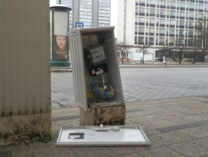 Vagy egy bénán parkoló autósnak, vagy egy utcán sétáló erős embernek volt útjában ez a Baross utcai, a járda szélére helyezett villanyóra-szekrény. Mindenesetre pár napja elvesztette eredeti alakját és az ajtaja is megadta magát, így szabad préda, avagy potenciális veszélyforrás. Milyen szép lenne, ha az, aki tönkretette, vállalná tettét, és igyekezne, hogy mielőbb visszaálljon a régi rend. Kár, hogy több esély van hosszú ideig így nézni ezt a villanyórát.