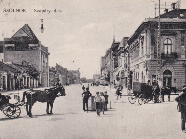 És milyen jó lenne tudni, hogy vajon mi lett a sorsa annak a három 5-6 év körüli gyereknek, akik szándékosan vagy véletlenül kerültek a fotó középpontjába! Túlélték az első nagy háborút? Szolnokon voltak fiatalok, vagy ugyanúgy elhagyták a várost, mint Manciék? Mellettük egy idősebb fiú, de az is lehet, hogy férfi áll, talán éppen a felvétel bal szélén lévő fiáker kocsisa. Ne szépítsük a dolgot! Az, amire támaszkodik – valahol a mai Baross és Szapáry utcák kereszteződésének a közepén -, nem más, mint a lóvontatású bérkocsikat kiszolgáló, akár a kellemetlen végtermékek elhelyezésére is alkalmas láda. Merthogy ez a kereszteződés már akkoriban is a város egyik legforgalmasabb pontja volt, ahol előszeretettel várakozhattak a bérkocsik, amikből ekkoriban több mint hetven koptatta Szolnok utcáit.