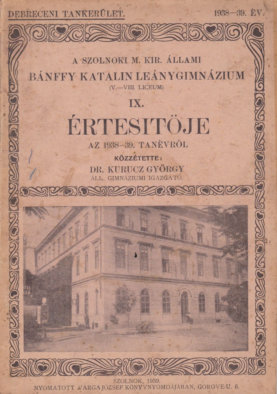 A kiadvány az épület sanyarú sorsa mellett felsorolja a tanárikar tagjait – 15 tanár, 5 hitoktató, 1 iskolaorvos és 3 altiszt gondoskodott a 307 tanulóról -, az oktatott tárgyakat, a használt tankönyveket, a tanulók eredményeit, a „szabadidős tevékenységeket” és egyéb statisztikáit. De ezeknél érdekesebbek a pedagógusok által írt hosszabb-rövidebb tanulmányok. Például a tanulók magaviseletéről, amit nagyjából úgy lehetne összefoglalni, hogy a mai diákok dédnagymamái sem voltak illedelmesebbek és tisztelettudóbbak, egy négy oldalas cikk sorolja a problémákat. Nem kevésbé érdekes az 1938-39-es tanév eseményeiről szóló beszámoló, hiszen akkor került vissza Magyarországhoz a Felvidék és a Kárpátalja egy része. A kormányzó bevonulását rádión hallgatták a diákok, akik úgy feldíszítették az épületet, hogy annak napokig csodájára jártak a szolnokiak.