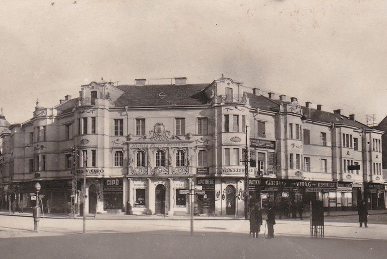 A Wéber-féle étterem, fölötte lakások a fotó bal szélén, a szolnoki palotasoron a harmincas években