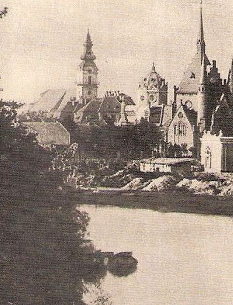 Ezen az első vasszerkezetes Tisza-híd Móricz-liget felőli végéről készült fotón mindaz rajta van, amit Szolnok a húszas évek végén világgá akarhatott kürtölni magáról. A bal szélen ott sorakozik a három, a városban akkor még egymás mellett jól megférő felekezet temploma: a katolikusoké, az izraelitáké és a reformátusoké. Ugyancsak látszik a Belvárosi Nagytemplom és a Zsinagóga között az 1914-ben átadott Polgári Leányiskola, miként a felvétel jobb szélen ott van az 1912-ben elkészült, majd a húszas évek második felében újra használhatóvá tett Városi Színház is. A felvétel fókuszában pedig már áll Szolnok akkori új turisztikai vonzereje, a gyógyfürdővel egybeépített, elegáns Tisza Szálló, és bár a parti sétány még nincs kiépítve, de azért a parkból is látszik már valami. És mindez a Tisza partján, azaz a természet közelében. A Trianon után fő turisztikai célpontjait elvesztő országban, egy ilyen képeslap láttán nem az juthatott eszébe a kiruccanásokat önmaguknak megengedő tehetősebbeknek, hogy irány Szolnok?