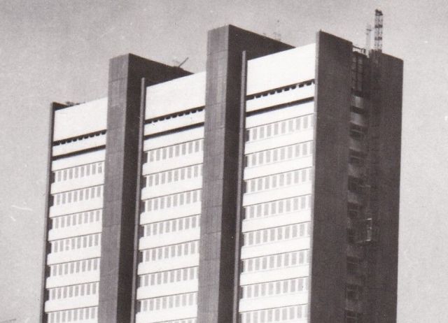 Mindez nagyjából egybe esett azzal az idővel, amikor Nagy Zsolt, a megyei napilap fotórovatának vezetője, Szolnok átépítésének megörökítője, ezt a képet is elkészítette. A Steiner-ház már nincs meg, helyén talán parkoló volt. Viszont a Vízügyi székház már szinte teljesen kész, csak a keleti falánál még látható teherlift, illetve a tetejéről hiányzó vörös csillag árulja el, hogy ez a kép az átadása előtt készült. Szerintem 1974-ben, amit nemcsak a tizenhét szintes irodaház építése támaszthat alá, hanem a Kossuth téren még működő lakberendezési áruház (a fotó bal szélét tessék nézni!). Néhány hónappal később már az Ady Endre utcai Domusban vásárolhattak bútorokat a sorra épülő, új szolnoki lakások boldog tulajdonosai.