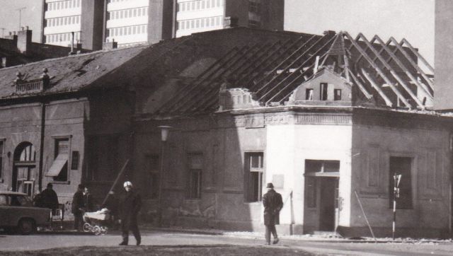 És persze a halálra ítélt Hubay utca 3. és 5. számú házaknál is érdemes egy kicsit elidőzni. A sarki épületben biztos, hogy valamilyen bolt működött a lebontása előtt. Igényes homlokzatából is megőrzött valamennyit ez a felvétel. A mellett álló Hubay utcai épület pedig igazi polgárház lehetett, nem középen elhelyezett bejárattal, alápincézve, minden bizonnyal több lakásnak is helyet adva. Néhány hasonló ház még áll a Baross és a Templom utca által körülzárt városrészben, bár szépen felújított, megmentett épületet nem tudnék mondani.
