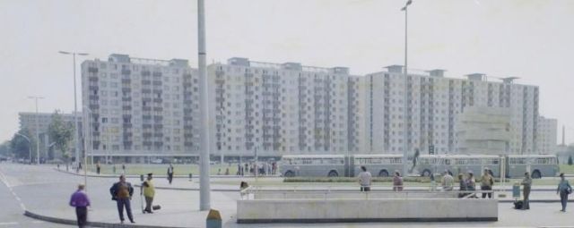 Ezt a képet az utóbbi években Váróterem kocsmaként működő vendéglátóhely teraszáról készítette a fotós, aki így tulajdonképpen megörökítette azt a panorámát, ami egy 1975 késő nyarán Szolnokra vonattal érkező először láthatott. A helyi járatú buszok egyik fontos csomópontja, az új Jubileum tér, a Tanúhegy című frissen felavatott szobor, illetve az akkor még Dr. Csanádi György körúti tízemeletesek tárultak az érkezők elé. Csupa olyan dolog, aminek pár éve még nyoma sem volt, így kis túlzással, és amiknek köszönhetően hasonló kép bármelyik megyeszékhelyen készülhetett volna, hiszen ugyanilyen panelek, buszok, de még emlékművek is voltak a többi városban is.