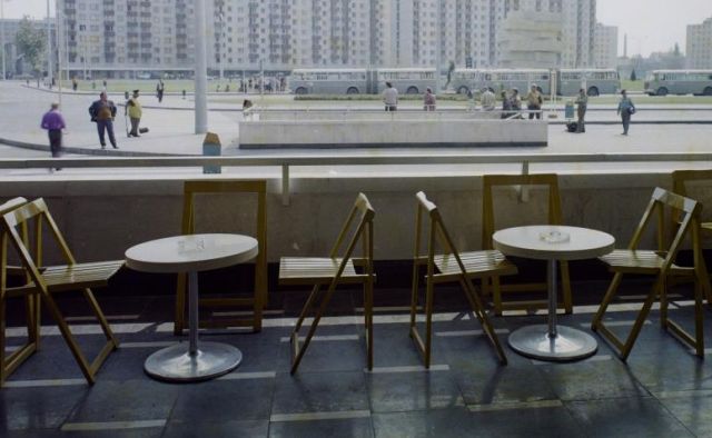 Bauer Sándor valószínűleg többször és több helyen is fotózott Szolnokon a hatvanas-hetvenes években. Legalábbis erre következtethetünk a nagyszerű Fortepan fotógyűjteményben lévő képeiből, amelyeken több szolnoki vendéglátóhelyet is megörökített. Nem véletlenül, hiszen a hányatott sorsú fotóriporter – 1950 és 1953 között kitelepített – 1960-tól az akkori Belkereskedelmi Minisztérium kiadásában megjelenő Vendéglátás című lapnak volt a munkatársa, és ebben a minőségében lényegében végigfotózta a fejlődő Magyarország új éttermeit, presszóit és üzleteit. Ezért járhatott 1975 nyarán az új szolnoki vasútállomáson is, ahol több képet is készített, megörökítve a hatalmas csomópont vendéglátóhelyeit. Így a Fortepan-on elérhető két képe a számomra legendás, várótermi étel és ital automatákról, a vasútállomás önkiszolgáló étterméről, valamint a földszinten kialakított presszó, térre nyíló teraszáról. Ez utóbbiról szeretnénk kicsit bővebben írni.