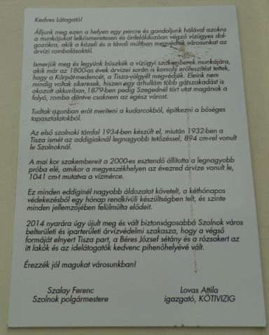 Nehéz eldönteni, hogy Szolnokot, lassan ezer éves történelme során a háborúk, a tűzvészek vagy az árvizek pusztították, illetve veszélyeztették-e többször. Azt azonban akár tényként is kezelhetjük, hogy az utóbbi kétszáz év nagy árvizeinek többségéből az ember került ki győztesen. Engem erre emlékeztet a Történelmi vízmérce.