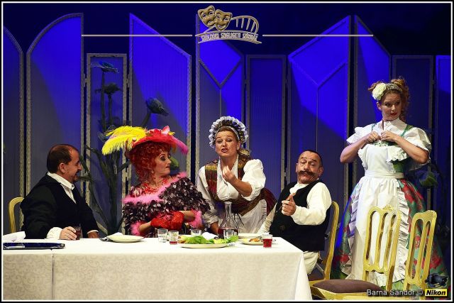 Vagy csak nekem nem jött át a többi szereplő. Kinczel József – egyébként koreográfus, sokszor amatőr színész – Üvegtigrisből átemelt Király Sanyijának például sem a helyét, sem az indokoltságát nem találom. Miként azt sem értem, hogy a jobb szerepekre érdemes Sárvári Diának miért kellett debilt alakítania. Vagy, ha már Lugosi Claudia végig tót tájszólásban nyomja Adamecznét, akkor az első felvonásban még hasonló akcentust használó Mészáros-Zelei-Horváth trió ezt később miért felejti el? Kertész Marcella nyelveket keverő párizsi műlovarnője legalább végig, egyenletesen ripacs és rikító. Ja! És a kutya? Cuki, a jelmezt viselő kisgyerek az egyik legkeményebb munkát végzi. De minek is?