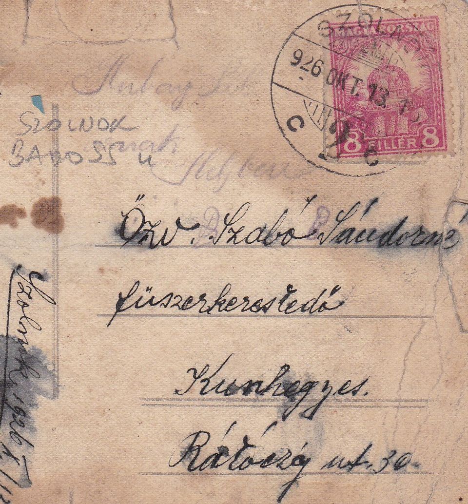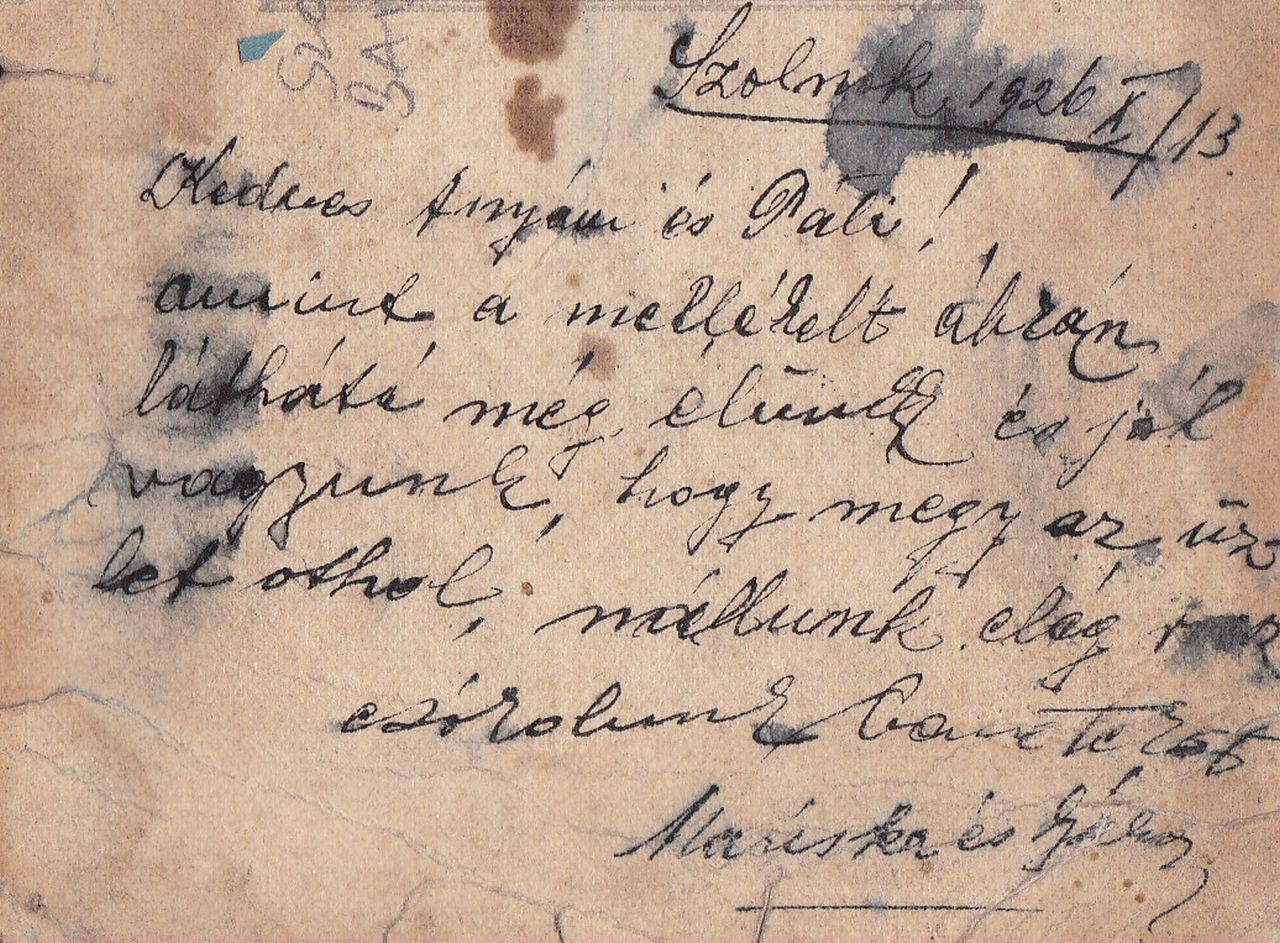 Hogy ez a képeslappá lett fotó Szolnokon készült, azt leginkább a hátuljára írt szöveg árulja el. Ezt az anzikszot ugyanis 1926. október 13-án Mariska és Gábor küldte Szolnokról Kunhegyesre, özvegy Szabó Sándorné fűszerkereskedőnek, Mariska édesanyjának („Kedves Anyukám”). A szolnoki postázást nemcsak az épen megmaradt körbélyegző felirata, de a gondos levélíró datálása is bizonyítja, ami a szövegesrész jobb felső sarkába került. Ám ennél is többet árul el az egyébként nehezen azonosítható helyszínről Mariska rövid üzenete, merthogy azt írja: „amint a mellékelt ábrán látható, még élünk és jól vagyunk”. Azaz, ha Szolnokról küldték ezt a képeslapot, akkor a „mellékelt ábra” arra utalhat a képeslap írója is látható a fotón, azaz a három megörökített boltból valamelyik az övék. És, hogy a képeslap írói is kereskedők, azt a rövid üzenet második fele igazolja: „hogy meg az üzlet otthon, nálunk elég rossz”.