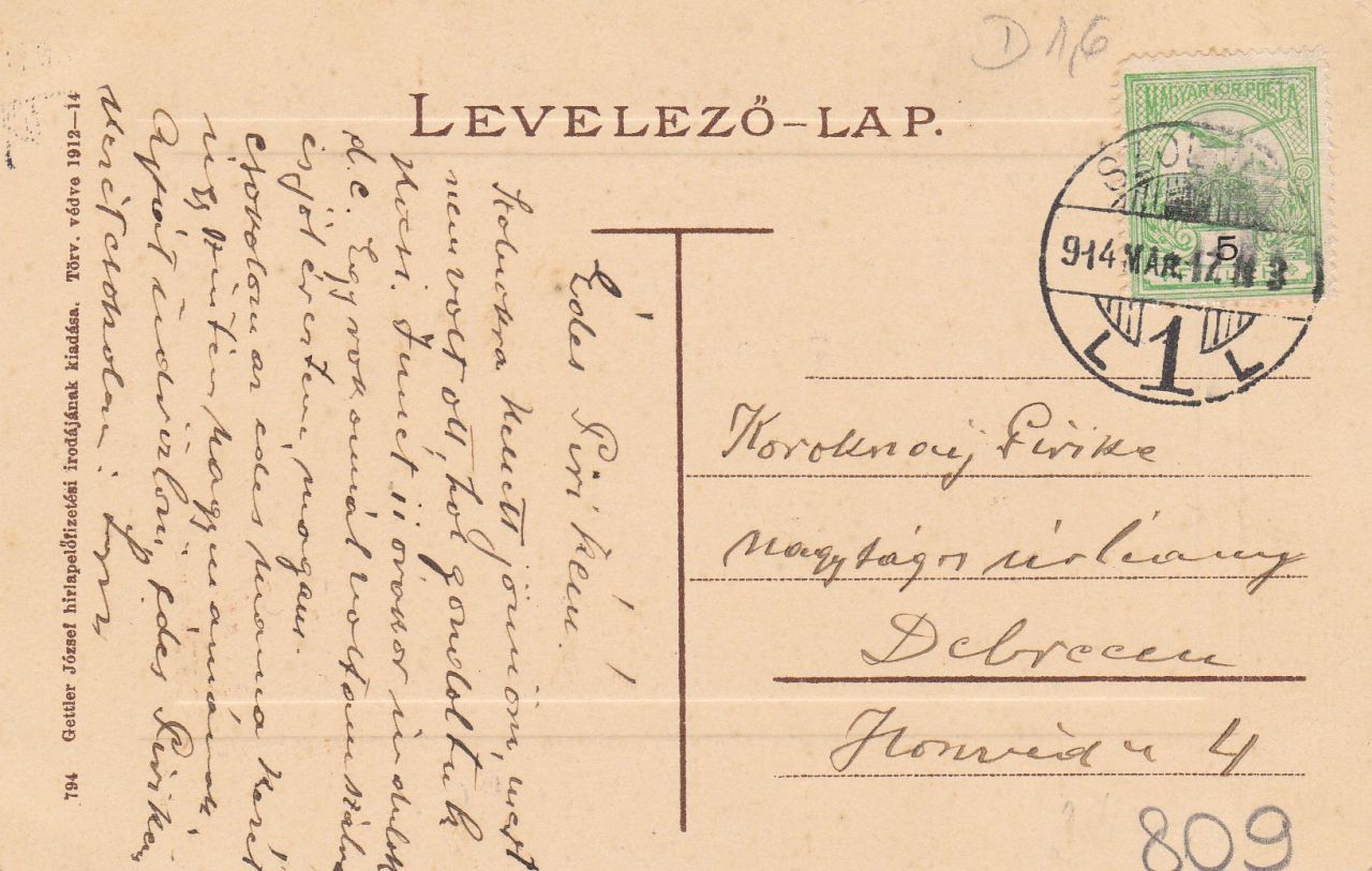 Érdekes belegondolni, hogy amikor ehhez a barnított, kereténél dombornyomott, kifejezetten jó minőségű kartonra sokszorosított szolnoki képeslaphoz használt fotó készült, a városházánk még harminc éves sem volt. A szerintem debreceni illetőségű Koroknay Lajos ugyan 1914. március 14-én adta fel Szolnokon az itt bemutatott képeslapot, azonban a hátlapra nyomott információk szerint a kiadványt 1912 és 1914 között forgalmazták. Azaz a szolnoki Gettler József hírlapelőfizetési irodájának felkérésére 1912 előtt kellett készülnie a felhasznált fotónak a szolnoki Kossut térről. Mivel azt gondolom, hogy ez egy igényesebb kivitelű lap volt annál, semmint valami régi felvételt használjanak fel hozzá, az itt látható kép 1911 nyarán készült nagyjából a mai gördeszkás kisfiú szobrának környékéről. A tulajdonomban lévő példányt pedig Koroknay Pirikének küldte a testvére, akinek valamiért Szolnokra kellett utaznia, ahol rokonoknál tudott megszállni, és leány testvérén keresztül édesanyját és nagymamáját is csókoltatta.