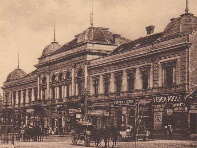 A felvétel igazi békebeli, hétköznapi pillanatot örökített meg. A kép jobb oldalán a szolnoki városháza épületét látjuk, aminek Kossuth tér felé néző szárnyának földszintjén legalább tíz üzlet sorakozott. Ekkor már vagy letelt az építésére felvett kölcsön törlesztése, vagy az utolsó részleteknél tarthatott Szolnok, aminek fedezetét ugye a városháza földszintjén lévő üzletek bérleti díjai biztosították. Maga az épület a fotó készítésekor még nem volt harmincéves, hiszen az 1881-ben kezdett, majd elakadt és 1882-ben új lendületet kapott építkezés 1884-re fejeződött be. És született egy olyan városháza, amivel szemben elvárás volt, hogy bálteremnek is otthont adjon, illetve a hivatal mellett polgármesteri lakás is legyen benne. Persze, az átadáskor még egy alig húszezres, e fotó készítésekor meg negyvenezres várost kellett innen szolgálni.