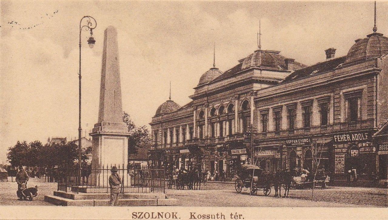 A távol zajló csaták néhány év alatt Szolnokon is szétrobbantották az ezen a képen ránk maradt békebeli hangulatot. Megakasztották azt a fejlődést, aminek a nyomai ezen a képen például az obeliszk mögötti, igényes, kovácsoltvas kandeláberben, a városháza előtt is látható többkaros villanypóznában, vagy éppen a piactér és a főút találkozásához ültetett facsemetékben is tetten érhető. Vagy éppen a lap bal szélén, a fák koronája mögött kilátszó megyei kaszinóban és a Kintzel-házban, a tehetős polgárság létében is visszaköszön. Az ismeretlen fotós egy dolgos hétköznapot örökített meg talicskás emberrel, bérkocsival, a főtéri üzleteket feltöltő rakodókkal és vásárlókkal.
