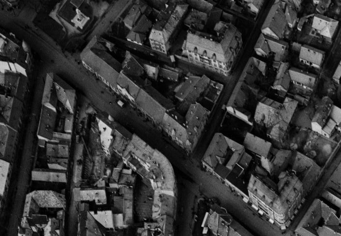 Az ismeretlen fotós a mai Baross utca páros oldalán, a Madách és a Mária utcák torkolatai közötti szakaszon állva örökítette meg Szolnok főutcájának páratlan oldalát. A romhalmaz helyén, amelynek eltakarításán sokan serénykednek, ma a Budapest Bank magányos székháza áll. A bontási terület mögött látható földszintes és kétemeletes ház a Szív utcához tartozik, de ezek sincsenek már meg. Helyükön egy nagy üres telek található, egyik sarkában a borzalmas lángosos lakókocsival, a másikban pedig két, torzóként maradt kő kapufélfával. A legtávolabbi, legmagasabb ház az egyetlen, amelyik ma is a helyén van: a Pelikán szálló mellett, a parkoló szélén, már a Jászkürt utcához tartozva. (A mellékelt kép az SZTK felől nézve mutatja ezeket a telkeket, a tűzfalat és a Budapest Bank Szív utcai homlokzatát – a szerk.)