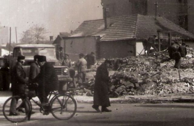 Ezt a képet egy csomag fotóval együtt Pap Bélától kaptam, készítőjének a nevét nem mondta meg, csak annyit, hogy anno a város építkezéseit örökítette meg. A Kossuth tértől a Gólyán át a Tiszaligetig nagyon sok helyről készített fotókat 1961 és 1966 között. Sok helyre többször is visszament, így például ezt a bontási helyszínt is megörökítette bő egy évvel később. (A mellékelt fotó 1966 októberében készült – a szerk.) Hogy mi lehetett a célja ezekkel a képekkel, nem tudom, csak feltételezem: a munkája összefügghetett a városban zajló beruházásokkal. Ami a hatvanas évek elején kezdett beindulni, hogy aztán a hetvenes években dübörögjön igazán, és megszülethessen az új belváros, a Jubileum tér környéke vagy éppen a Móra úti lakótelep.