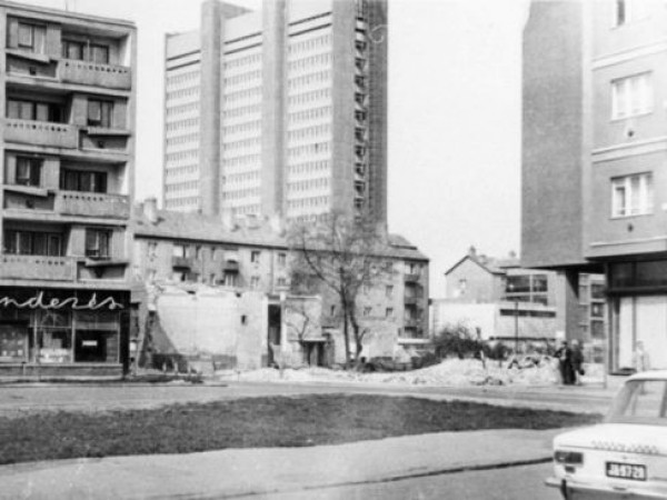 A fotó fókuszában lévő bontási terület is az 1975-ös évet valószínűsíti, hiszen az ugyancsak az 1xVolt rovatunkban közölt, Felvonulók nézték című cikkhez kapcsolódó fotókon az látszik, hogy az itt felépülő TB-székház 1976. április 4-ére már szerkezetkész volt.
