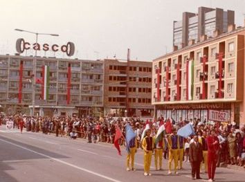 A Kossuth téren, nagyjából a mai rendezvénytér sarkán, valahol a Rotary-dombormű környékén állhatott az a fotós, akik 1975 kora tavaszán ezt a fényképet készítette, és amit a napokban a Google „ajándékozott” nekem. A kép születésének dátumát a két építkezés azonosítja be egyértelműen.