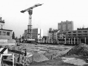 Danka István a megyei tervezővállalat fotósaként örökítette meg az egykori Nerfeld-palota bontását. Illetve több alkalommal is fényképezett az új ház építkezése közben. A képek tanúsága szerint ott volt az alapozásnál, a toronydaru beépítésénél, de a betonszerkezet felhúzásánál éppúgy, mint falazáskor. Dolgozott a helyszínen, a szomszédos házakból, de még a telken álló toronydaruból is. Összesen több mint száz kis nézőkép beszkennelt változatát kaptam meg tőle, amelyekből most csak néhányat tudok bemutatni.