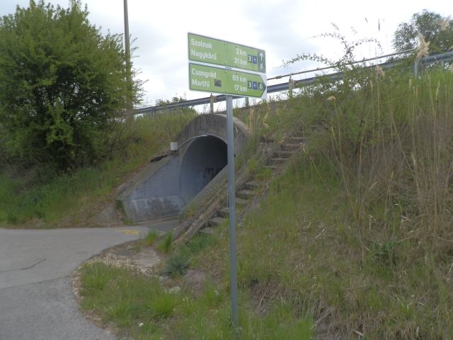 Ezután következik az a bizonyos „kerékpáros műtárgy”, ami egy három alagútból és két rámpából álló építmény, ami nemcsak a 4-es főút fölötti átkelést segíti, de a Holt-Tisza túloldalára is átvezeti a bringautat. Az alagutak jó ideje kivilágítottak, viszont mivel mindháromnak az egyik végénél szinte derékszögben kanyarodik a kerékpárút, érdemes figyelmesen közlekedni. Én például fütyülni szoktam, bízva abban, hogy a szemből érkezőnek nincs bedugva a füle. (Lehet, hogy egy-egy közlekedési tükör is jó lenne.) A felüljáró egyben Szolnok legnagyobb emelkedője is, ami jól láthatóan néhányakat életveszélyes kerülőre ösztönöz. A kevésbé veszélyesen élők csak az alagutakat hagyják ki, és a 442-esen, az autók mellett kelnek át a felüljárón. Az orosz rulettet játszók viszont a lejtőket megúszva lent, a 4-esen átvágnak, miként a kitaposott ösvények is bizonyítják.
