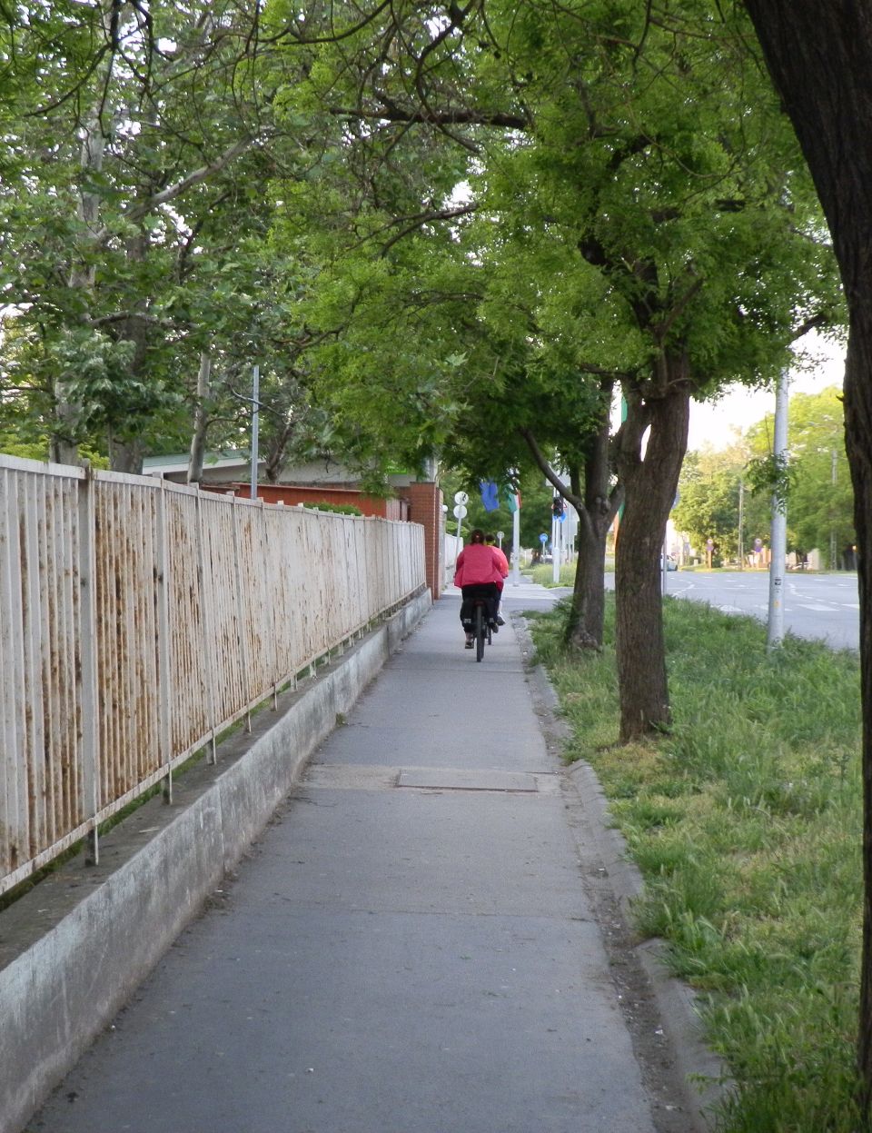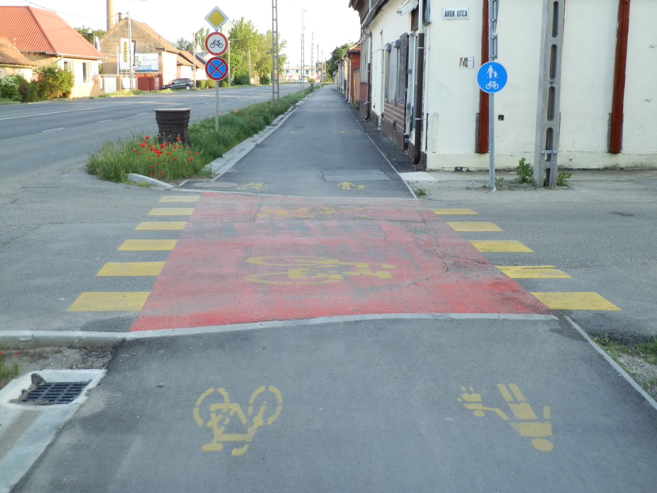 Legalább úgy, ahogy a Tószegi úti kereszteződéstől a kórházig majdnem mindenütt sikerült, így jó elkülönül a kerékpárút a járdától, ami még akkor is jobb megoldás, ha így szűkebb hely áll mindkét fél rendelkezésére. Persze ezen a részen is érdemes óvatosan tekerni, hiszen két buszmegálló, több utcai kereszteződés és egy bringautat elválasztó villanyoszlop akadhat az utunkba. A jelenleg még kiváló szakasszal szemben maximum két kifogást tudnák megfogalmazni. Mind a Csáklya, mind a Vágóhíd utcák felé, illetve azokon keresztül viszonylag egyszerűen össze lehetett volna kapcsolni az új bringautat a Tisza gátján futó régivel, amiknek köszönhetően lényegében a déli iparterületek és a belváros felől is kialakulhatott volna a kórház felé a kerékpárút összeköttetés. Ezekere a ma még hivatalosan nem létező, de a gyakorlatban alkalmazható lehetőségekre akár táblák is felhívhatnák a bringások figyelmét. Ennél talán gyorsabban orvosolható a másik problémám: az új kerékpárút fölé belógó faágak metszése. Azt hiszem, az enyémnél kisebb kerékpáron közlekedő, nálam alacsonyabb emberek szemét is meg lehetne kímélni némi rendszeres karbantartással.