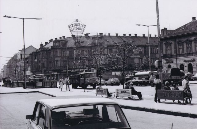 A felvétel jobb szélén a Kindlovics-bazárt látjuk, aminek földszintjén ma éppen pékség működik. A fotózás pillanatában azonban könyvesbolt üzemelt benne, és bár ezen a képen nem látszik, de egy másik felvétel alapján úgy tudom, Szigligeti Ede nevét viselte. És talán ugyanúgy az IKV, azaz az Ideál Kiskereskedelmi Vállalat működtette, mint a fotó előterében lévő padok hátulján reklámozott üzleteket. A Domus lakberendezési áruházat az Ady Endre úton – ami nem sokkal e kép készítése előtt nyílt meg – és az 1974-ben átadott Sztár áruházat is, ami egyébként ott áll a Nerfeld-palota mögött, alumínium kockákba bugyolálva. A középső padon hirdetett „gazdabolt” – ami ekkor a Jubileum téren, majdnem a piros iskolával szemben volt – viszont az Agrokeré volt, és aki kerti eszközöket vagy vetőmagot akart beszerezni, általában ott kezdte a vásárlást.
