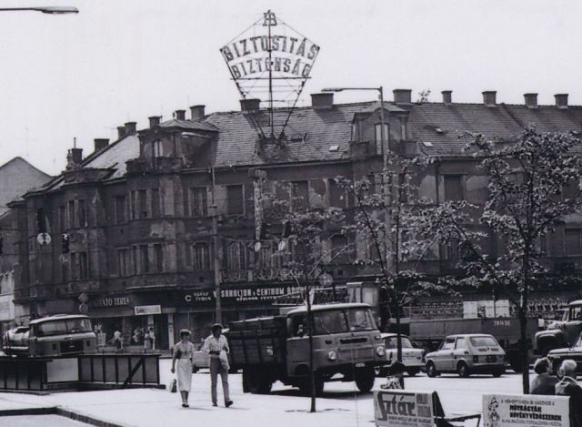 Ez a felvétel nagyjából ötven esztendővel a Nerfeld-palota megnyitását követően – benne Szolnok első, modernnek tekinthető áruházával -, és tíz évvel a máig legendákkal átszőtt Centrum-tűz után – ami nevét az ott működő korábbi Alföld, majd Centrum áruházról kapta – készülhetett. Amikor már nagyjából üresen, bontásra előkészítve állt az akkori Ságvári és Beloiannisz utcák – ma Boldog Sándor István és Baross – kereszteződésének képét meghatározó eklektikus stílusú, szobrokkal, erkélyekkel, kiugró ablakfülkékkel díszített ház. Tetején Szolnok talán első fényreklámjával, amely az akkor egyetlen, állami biztosítótársaságot volt hivatott „hirdetni”, vagy inkább a szemben lévő TOMI reklámmal együtt a város „fényes” fejlődését szimbolizálni. Hogy aztán néhány hónappal később építési terület legyen ezen a helyen, majd felépüljön – szerencsére nem egy 23 emeletes toronyház – a ma is ott álló, szerintem jóval rondább Árkád, földszintjén ugyancsak üzlethelyiségekkel, emeletén pedig lakásokkal.