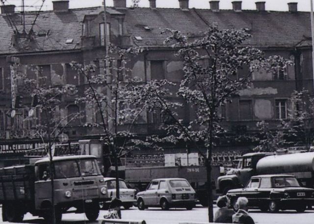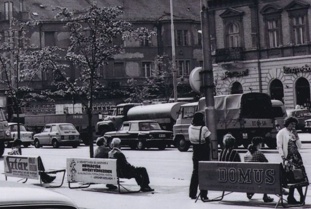 A felvétel jobb szélén a Kindlovics-bazárt látjuk, aminek földszintjén ma éppen pékség működik. A fotózás pillanatában azonban könyvesbolt üzemelt benne, és bár ezen a képen nem látszik, de egy másik felvétel alapján úgy tudom, Szigligeti Ede nevét viselte. És talán ugyanúgy az IKV, azaz az Ideál Kiskereskedelmi Vállalat működtette, mint a fotó előterében lévő padok hátulján reklámozott üzleteket. A Domus lakberendezési áruházat az Ady Endre úton – ami nem sokkal e kép készítése előtt nyílt meg – és az 1974-ben átadott Sztár áruházat is, ami egyébként ott áll a Nerfeld-palota mögött, alumínium kockákba bugyolálva. A középső padon hirdetett „gazdabolt” – ami ekkor a Jubileum téren, majdnem a piros iskolával szemben volt – viszont az Agrokeré volt, és aki kerti eszközöket vagy vetőmagot akart beszerezni, általában ott kezdte a vásárlást.