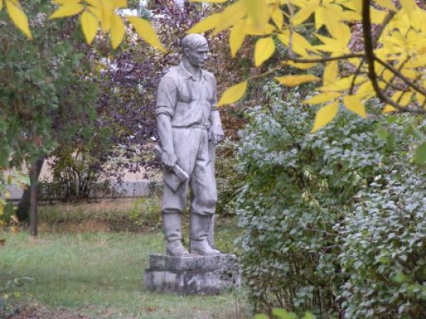 Megfáradt? Szomorú? Vagy csak elgondolkodott? Nehéz eldönteni Gyenes Tamás (1920-1963) Munkácsy-díjas szobrászművész Ácslegényéről, hogy a művész éppen melyik pillanatot örökíti meg. Az biztos, hogy e két méternél is magasabb kőszobor robosztus alakja csizmában, feltűrt ingujjban, jobbjában szekercét tartva, baljával valamin támaszkodva, jólfésülten mered maga elé.