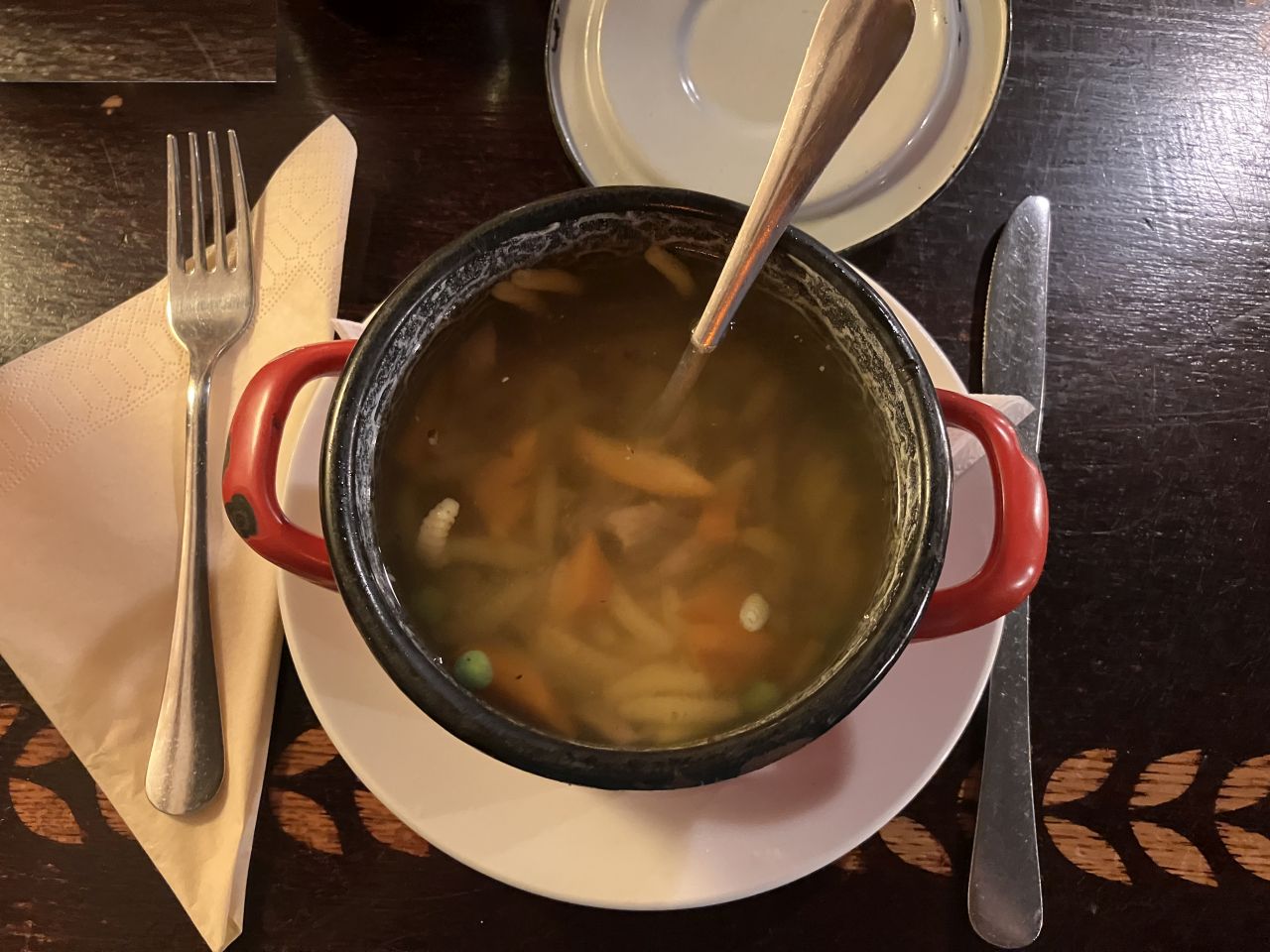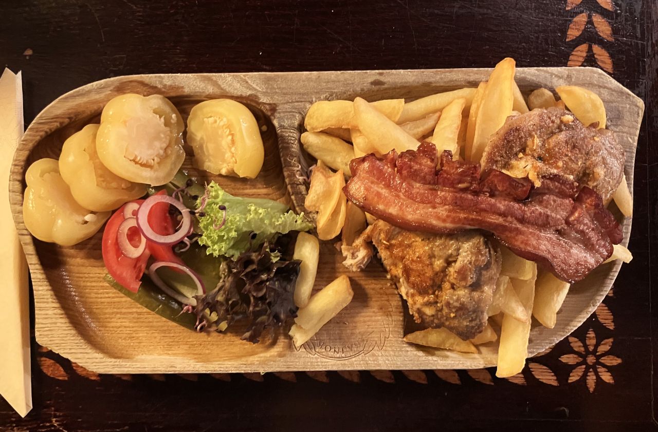 Magamon is nevetek, hogy második fogásnak is ugyanazt választottam: Alföldi zsiványpecsenyét savanyúsággal. És igen, ezt is pontosan ugyanúgy készítették el, mint kilenc évvel ezelőtt, mint a múlt hónapban, mint a nyáron, mint tavasszal, mint az év első napjaiban. Hát igen, be kell vallanom, ha úgy alakul, hogy csak egy jó, otthoni ízekre építő hétvégi ebédet szeretnénk, akkor irány a Bajnok. Mert nemcsak jól és lassan egy évtizede ugyanúgy főznek, hanem mert a kerthelyiségük pontosan ugyanolyan jó, mint a pincelabirintusok, a pincérek pedig mindig ugyanolyan kedvesek – nem tolakodók. És bár a kis piros lábaska meg a fatányér miatt könnyen eshetne a pesti turistalehúzók hibájába a hely, itt ez a fajta „körítés” nem a hiányosságok elfedését, a parasztvakítást szolgálja, hanem tényleg hozzátartozik az adott ételhez.