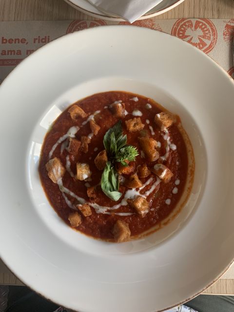 Ezeknél azonban fontosabb mindaz, ami az asztalra kerül. Először is egy vállalható összeállítású, kellő tételszámú, valóban olasz étlap (egy kivétellel, de erről még később). Levesük például csak egy van, de esküszöm, ne menjen oda, aki azt nem kóstolja meg. A legforróbb nyarak, legédesebb paradicsomjai köszönnek vissza a tányérból, ahol levesnek nem is nevezhető állagban tobzódik a valóban inkább gyümölcsnek, mintsem zöldségnek tekinthető csoda. Ehhez képest március végén persze haloványabb volt a paradicsomos bruschetta-juk, bár benne a nyár ígérete.