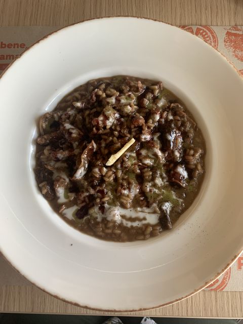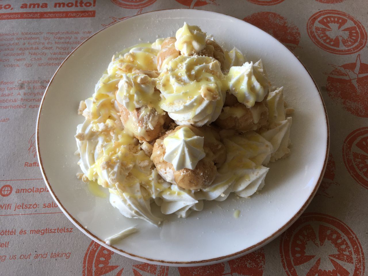 Egy ilyen helyen elsőre persze pizzát kell enni, és a tésztájukról ki merem jelenteni, hasonló jelenleg nincs Szolnokon. Ez nekem Olaszország, a tenger és a nyár, azaz majdhogynem tök mindegy, milyen feltéttel rendeltem. Ám az biztos, hogy legközelebb vargányás rizottót kérek, amibe ezúttal csak beleeszegetni tudtam, de teljesen elképedtem. Nem találok szavakat rá, mert az, hogy finom, az kevés. Most annyit tudok rá mondani: eszméletlen. És persze a desszert sem maradhatott ki: citromos habbal töltött profiterol. Jaj! A pokolba vezető út jó séfekkel van szegélyezve.