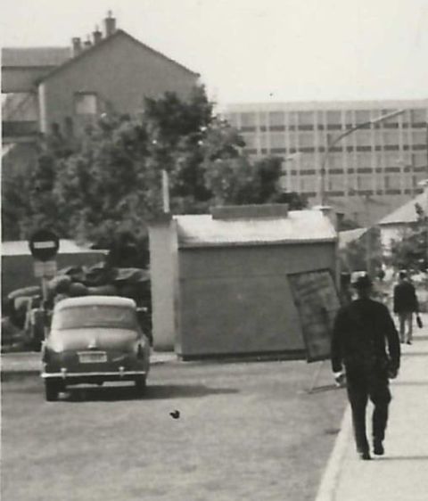 A fotózás helyszínét nem nehéz beazonosítani, hiszen a Ságvári – ma Boldog Sándor István – körúti házak az ötvenes évek óta állnak. Az Ady Endre út és a Ságvári sarkán lévő lakóház – az egykori Sarok ABC épülete – is elkészült az ötvenes évek végére, és a távolban lévő jellegzetes irodaház, a „pártház” is 1964 óta áll az új városközpontban. Tehát az ismeretlen fotós nagyjából annál a zebránál állt, amely ma is a piaci parkolóhoz vezető utcánál, az élelmiszerbolt előtt található. És pont a pártház, meg az élelmiszerbolt – a későbbi Centrum Pavilon áruház, aztán meg Centrum étterem – hiánya segít belőni a fotózás intervallumát. Szerintem 1965 és 1969 között készült a kép.