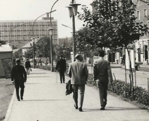 Dombi Gábor városvédő építésztől kaptam a mellékelt fotót, amelynek készítőjéről semmit sem tudok. Miként arról sem, hogy az illető a hatvanas évek második felében – és majd később is – miért fotózta végig szinte egész Szolnokot. Ezen a fotón is látszik, hogy nem ismerőst akarta megörökíteni – a kép minden szereplője háttal van a kamerának -, miként a táj szépsége sem lehetett az inspirátor. Valaki, valamiért a város korabeli állapotát akarta megörökíteni, ami akkoriban nem volt olcsó mulatság. Nemcsak egy jobb fényképezőgép került a hatvanas években egy havi fizetésbe, de a 24-36 kockás film, és aztán az előhívás is elég sok pénzt vitt el. Tehát valaki nemcsak időt és energiát, de megannyi forintot is áldozott arra, hogy megörökítse Szolnok építészeti változásait. A nagy változások előtt és közben.