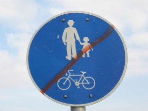 Ahogy idővel a Dami helyén épült új parknak is nevet kellened adni, mert így elég nehéz rá hivatkozni. Csak azt írhatom, hogy a strand helyén épült park a téli estéken elég sötét hely, a lámpák ugyanis még mindig nem kerültek a helyükre. Van viszont a sarkán egy érdekes tábla, amiről nehéz eldönteni, hogy hivatalos vagy gúnyos. A kék, kerek, gyalog- és bicikli utat jelölő táblát ugyanis valaki ecsettel húzta át pirossal. Így jelentheti azt, hogy az új park hivatalosan a gyalogosok és a bringások elől elzárt terület, meg azt is, hogy valaki kritikát fogalmazott meg az új parkkal kapcsolatban.