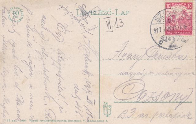 Az itt bemutatott képeslapot is egy katona küldhette Szolnokról 1917 kora nyarán. A hátoldal szövege miatt feltételezhetjük, hogy részben magyar nemzetiségű lehetett, aki éppen a soknemzetiségű Pozsonyba – akkor még a Magyar Királyság része – tartott. Összesen 20 akkori fillért költött erre a lapra és postázására. Ha jól sejtem, 1917. június17-én, egy nem várt szabadság miatt „repült” haza az ismeretlen katona, aki „egy lélegzetvételre” állhatott csak meg Szolnokon. Szerintem a keleti forintról jött, és a lap feladásakor úgy számolt, hogy a Magyar Királyi Postát megelőzve, akár aznap este Pozsonyban lehet.