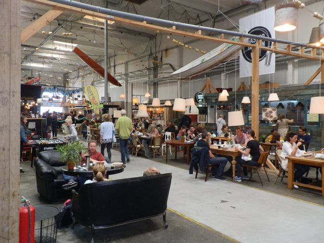 Mert különben nálunk sem tűnnének el régi, esetleg eredeti funkciójukat vesztett épületek a föld színéről, hanem – miként a fenti kép is mutatja – a gabona tárházból és egyéb ormótlan tárolókból lakóházak születhetnének. Ami azzal is együtt járna, hogy a régi gyárépületekben esetlen olyan étteremudvar jön létre – lásd a lenti képet -, ahol egész évben lehet különböző nemzetek konyháit élvezni. Miközben a szomszédos csarnokot fedett gördeszka pályaként hasznosítják, sőt a harmadikban meg ugyanazt csinálják, amit száz éve: hajókat építenek. Nem tudom, mit kellene tenni, hogy a magyar városépítészetben ne a beteg emberek lelövése, hanem a gyógyítása legyen a gyakorlat?