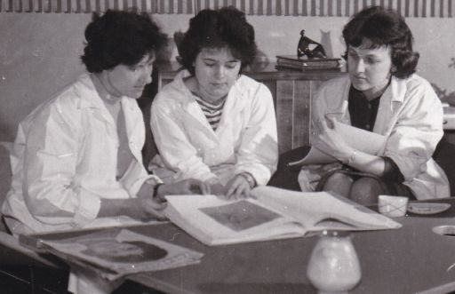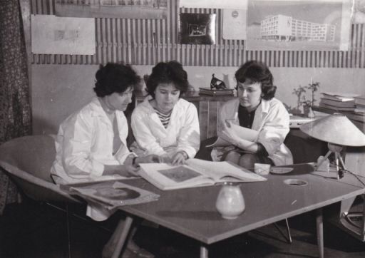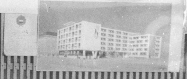 Érdemes egy pillantást vetni a három hölgy mögött lévő faliújságra. Csak a harmincasok és a fiatalabbak kedvéért: a jobb szélen ülő hölgy feje fölött a Kádár-címer látható, minden bizonnyal egy oklevél fejlécén. Ám ennél sokkal érdekesebb, hogy ettől jobbra, az ugyancsak a tervezővállalat által megálmodott „Lordok-házának” a rajzát látjuk, ami a fotózás pillanatában talán már épült a Szigligeti és a Táncsics út által határolt telken. Számomra minimum érdekes, hogy ezek szerint már a tervezésekor tudták, hogy a városháza felé néző, ablaktalan homlokzatra dombormű kerül. Sajnos a bal oldalon ülő két hölgy feje fölötti fotó nem azonosítható, csak annyi látszik, hogy egy sarki ház terve lehetett. A bal alsó sarokban pedig mintha egy lakás vagy iroda belseje lenne megrajzolva.