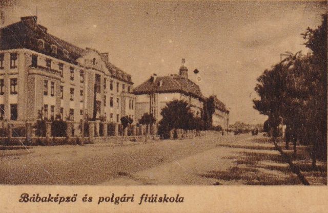 Lehetséges egyébként, hogy a három fotó ugyanazon a napon készült, miként az is, hogy a bal alsó sarokban lévő két évvel korábbi. A Baross utca számozás szerinti felső szakaszát, a vasútállomáshoz közelebbi részét mutató fotó ugyanis akár 1926-ban is megszülethetett, hiszen a képaláírást a bábaképző és polgári fiúiskola mellett nyugodtan kiegészíthették volna a gépipari akkori nevével. A műszaki oktatási intézményt ugyanis az iskolasor harmadik elemeként 1926 őszén adták át, de fotózni már nyáron is lehetett volna. Az ismeretlen fotós amúgy valahol a mai Jólét ABC környékéről dolgozhatott, és felvétele nemcsak ezen a kisnyomtatványon, de önálló kiadványon is megjelent.