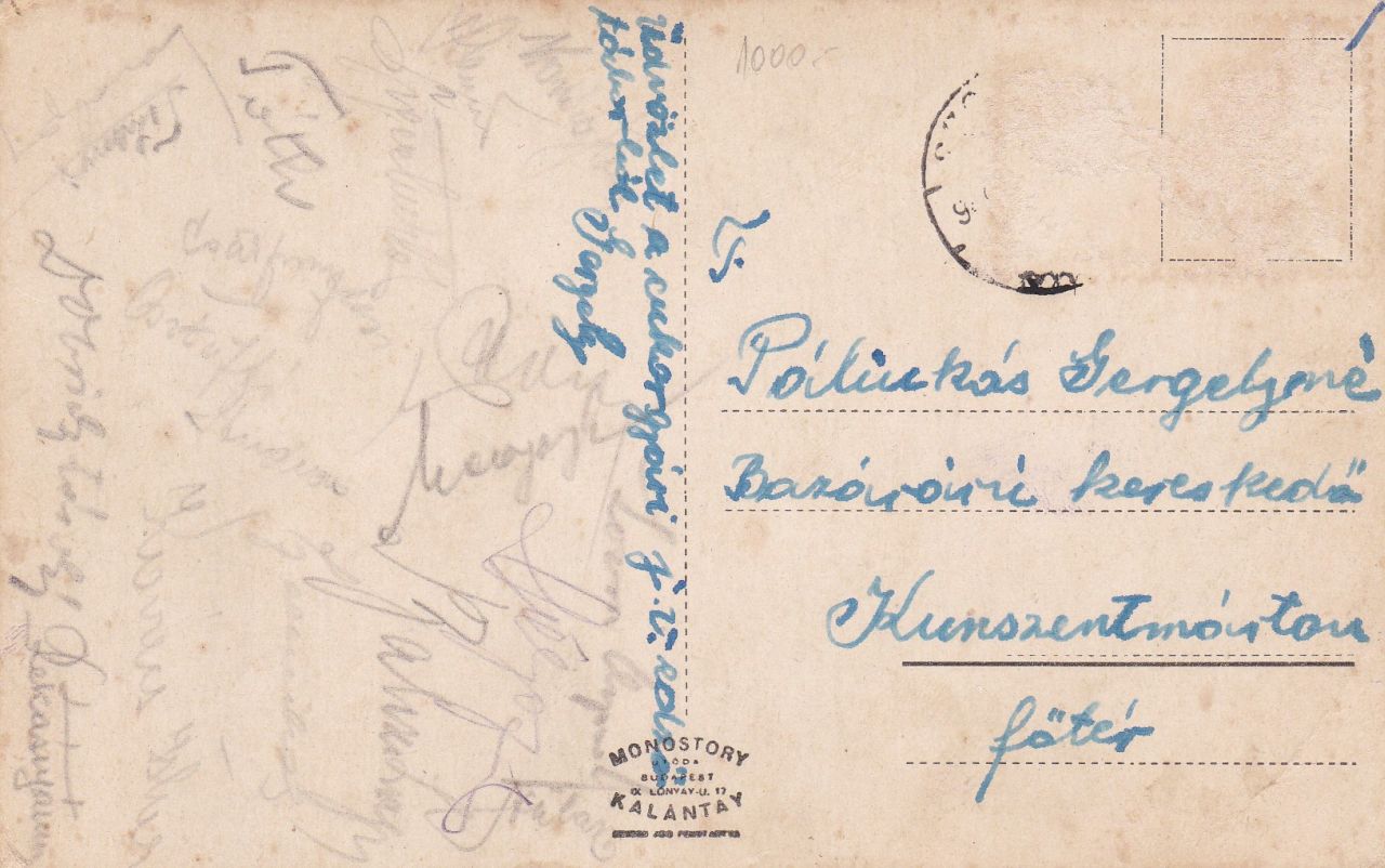 A régi képeslapokon lévő fotók datálását nemcsak a megörökített épületek fotói, hanem a hátoldalon lévő információk is segíteni szokták. A legkésőbbi fotózási lehetőséget behatárolja az anziksz postára adásának dátuma, ám az ebben az esetben a bélyeg barbár eltávolítása miatt nem látható. Sokáig segített a lapot írók által feltüntetett dátum, ami egykor az iskolázott emberek postai küldeményeinek elengedhetetlen része volt. Lehet, hogy tévedek, de sokszáz képeslap átbogarászása után úgy gondolom, a második világháború után ment ki a divatból az anzikszokon a datálás. Részben ezért is gondolom, hogy bár ez egy egyértelműen a második világháború előtt született lap, valamikor a negyvenes évek végén adhatták postára. Nem is akárhonnan. Hanem a szolnoki cukorgyárban rendezett valamilyen edzőtáborból. Sajnos nem lehet kibogarászni, hogy az ott „foci”, vagy „j. v.”, azaz esetleg játékvezetői jelző lenne. De esetünkben ez nem is fontos, mert ha tudnám, hogy mikortól lehetett az cukorgyárban edzőtáborokat is tartani, azaz mikortól volt ott erre alkalmas sportpálya, akkor közelebb kerülhetnék a lap postázási dátumához. A címzett szakmája, a bazáráru kereskedő ugyanis nem segít. Mert bár elsőre azt gondoltam, ez a foglalkozás az ötvenes évektől létezett, némi keresgélés után be kellett látnom, hogy tévedtem: már a húszas években is sokan foglalkoztak ilyesmivel. Tehát Gergely a harmincas évektől az ötvenesekig bármikor küldhette üdvözletét Szolnokról Kunszentmártonba, amihez úgy tűnik, másfél focicsapatnyi ember is csatlakozott.