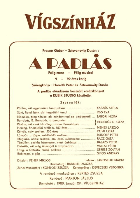 Messzebbről kezdem, majdnem harminc év távolságból. Nem tagadom, rajongója vagyok a zenés színháznak, legyen az operett vagy musical. Miként azt sem, hogy Szolnokon fertőződtem meg: 1986-ban a Rátonyi Róbert rendezte Csárdáskirálynővel, az 1987-ben itt vendégszereplő rockszínházas Jézus krisztus szupersztárral és az 1988-ban Schwajda György által írt Rákóczi térrel. Amikhez talán fél vagy egy évvel később jött a következő élmény, a néhai Kőolajos klubban működő Fasírt színpadon, ahová valaki behozta kazettán A padlás teljes hanganyagát. Beszippantott. És iszonyatosan fájt, hogy én azt nem láthatom. Úgyhogy, amikor már egyedül járhattam Pestre színházba, talán ez volt az első vagy a második darab, amit megnéztem. (Azóta többször is, több helyen is.)
