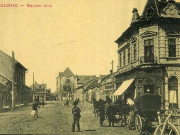 A korabeli fotós nagyjából a mai Kossuth téri lottózóval egyvonalban, az egykori főutca közepén állíthatta fel masináját, szerintem valamikor 1910 és 1914 között. Aztán átadta a felvételt a képeslap kiadójának, ahol meg sikerült hibás feliratot rakni a képre. Ez a képeslap ugyanis nem a szolnoki Baross utcát ábrázolja, sőt a Baross utca még csak nem is látszik rajta. Régi térképek alapján azt mondom, hogy a Gorove utca feliratnak kellett volna kerülnie erre az anzikszra, hiszen a jobb szélen látható Steiner Jakab és Fiai féle emeletes ház a Kossuth tér és a Gorove út sarkán lévő, egykori 15. számú telken állt.